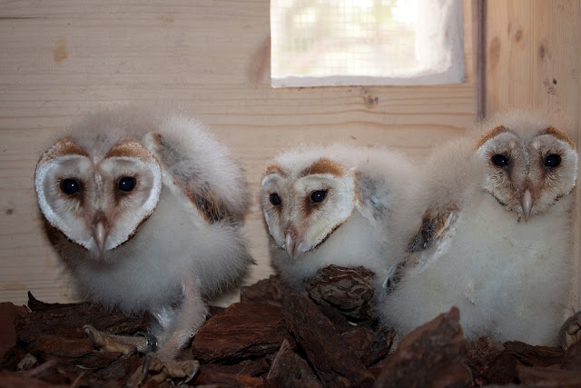 Pollos de Lechuza común en una caja nido instalada dentro de un edificio