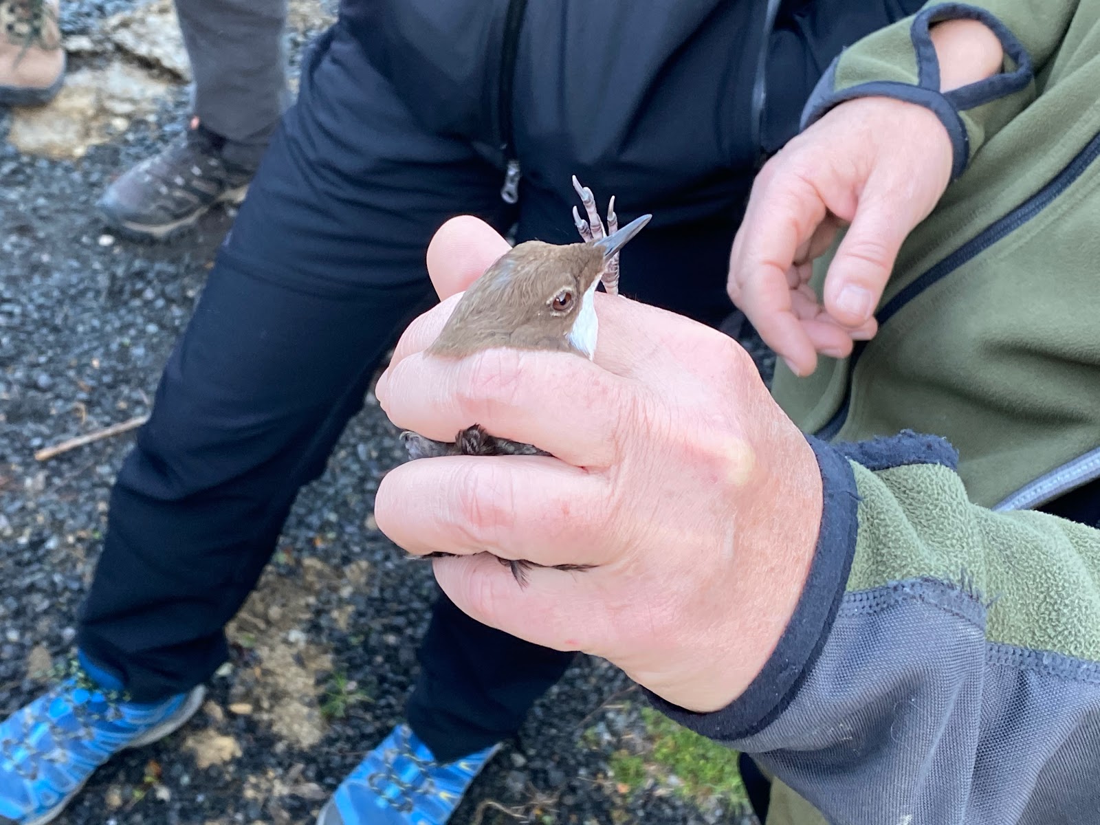 La primera parada la hemos hecho en el río Oka a la altura de Muxika. Allí Aitor había capturado un mirlo acuático como parte de su actual proyecto de seguimiento de esta bonita ave. El mirlo acuático es bimbo para varios de los asistentes, así que ha sido una estupenda manera de empezar un día de pajareo.
