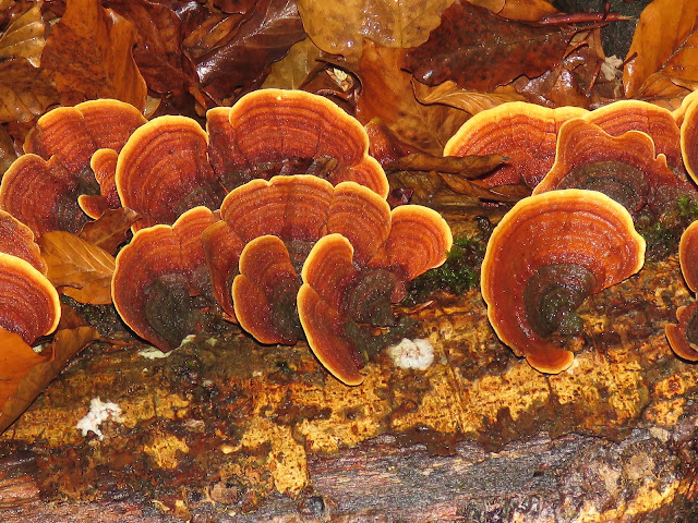 Volvemos sobre nuestros pasos y enseguida han empezado a aparecer ejemplares colosales de Fomes fomentarius y Trametes versicolor de todos los colores.