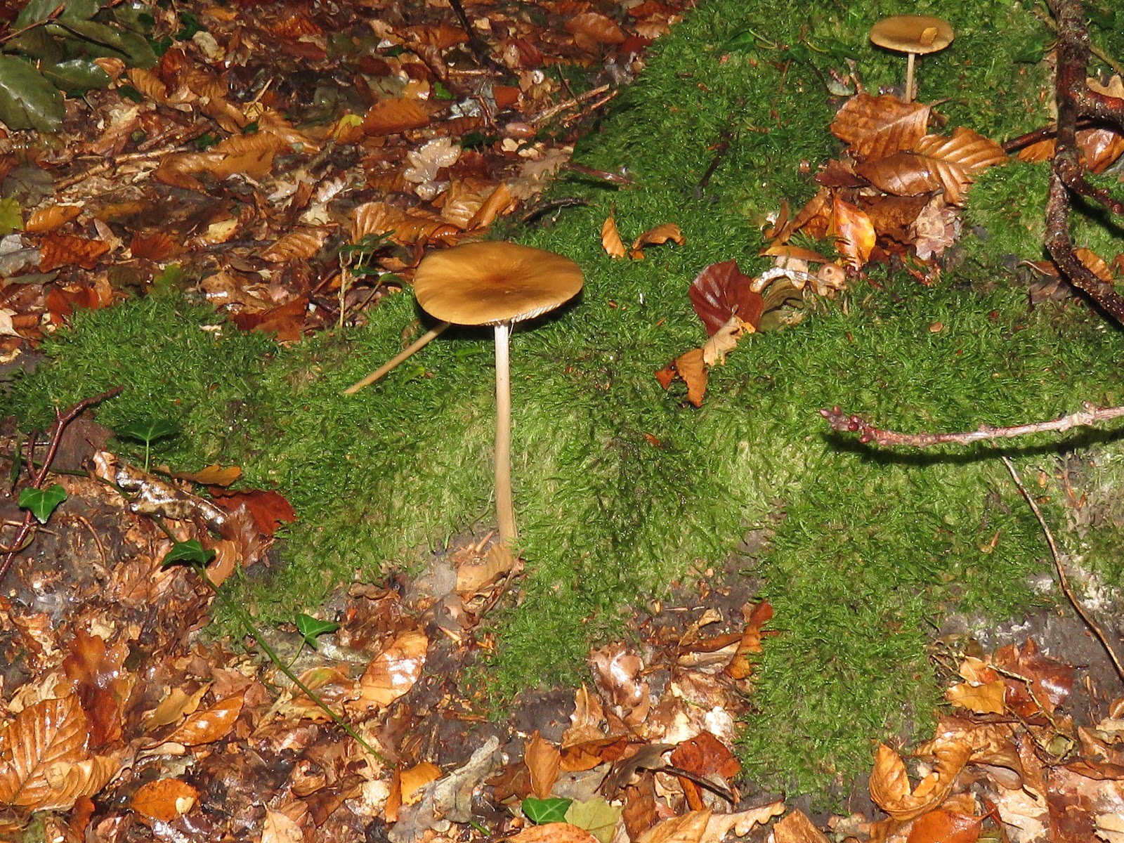También vimos las preciosas Amanita muscaria, toxicas y alucinógenas, así que las dejamos tranquilas. Fuimos bajando hacia un barranco con un pequeño arroyo, y localizamos una gran variedad de especies: desde pequeños Marasmius y Micenas, hasta Lepiotas de tamaño pequeño y, por tanto, sospechosas de no ser Macrolepiota procera, buen comestible.