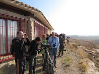 El sábado 3 de octubre emprendimos una visita a dos de los humedales mas afamados -al menos desde el punto de vista ornitológico- del Valle del Ebro: el embalse de Las Cañas y la laguna de Pitillas, ambos en Navarra. La actividad se enmarcó en la celebración del Día de las Aves, evento internacional coordinado en España por SEO/BirdLife. Tanto Las Cañas como Pitillas figuran en el área de distribución de las poblaciones nidificantes de un pequeño pájaro palustre, el escribano palustre, a su vez declarado Ave del Año. Aunque parte de las poblaciones europeas invernan en la Península Ibérica, en la época de cría la población está seriamente amenazada de desaparición. En el País Vasco las últimas citas confirmadas son de los años 90, y en toda Navarra en el censo de 2005 apenas se detectaron una decena de territorios ocupados. Así que había excusas suficientes para organizar la visita.