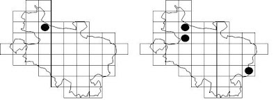 Figura 1. Cuadrículas UTM de 100 km2 con presencia detectada de picamaderos negro según el atlas de aves reproductoras de 1998-2001 (izquierda) y el atlas de aves invernantes de 2002-2005 (derecha).