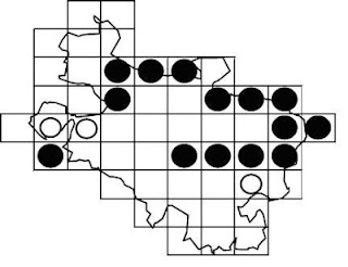 Figura 3. Cuadrículas UTM de 100 km2 en el área de estudio con presencia confirmada (círculos rellenos) o posible (círculos vacíos) de picamaderos negro durante la primavera de 2011.