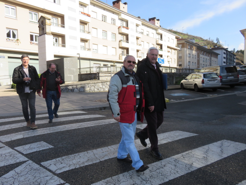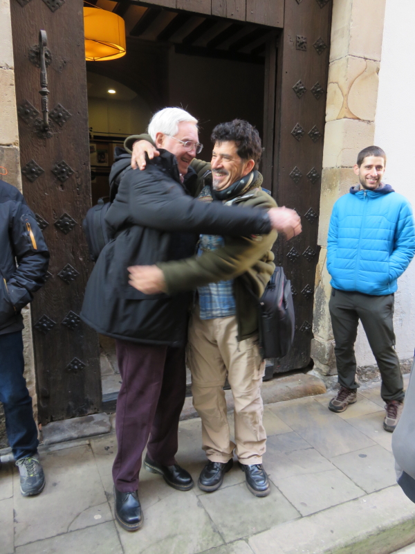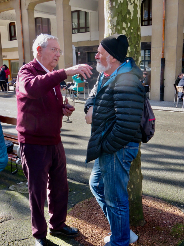 En las plazas, entramos en algunos bares a reponer fuerzas y la mañana se fue deslizando entre intensas charlas y paseos hacia el río Deba. Pero antes, otro hito de esta villa ilustrada e innovadora, el abrazo de Bergara, el tratado de paz que puso fin a la primera guerra carlista, modelo de resolución de conflictos, y que se conmemora con un memorial en el palacio Urrutia-Espila, donde se firmó la paz. En la puerta, dos de nuestros botánicos, Pello Urrutia y Javier Elorza, emularon el hecho y sellaron su longeva amistad y ausencia de carente de conflictos bélicos con un abrazo solidario, que, por supuesto, fotografiamos. Lo estábamos pasando en grande.