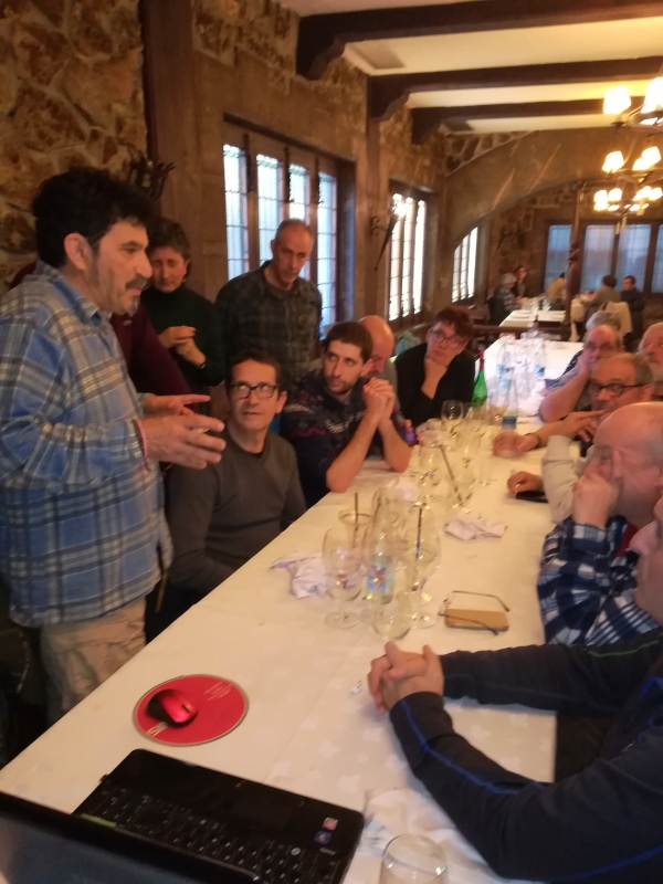 Comimos muy bien y a gusto en el restaurante tradicional Zumelaga, a orillas del río Deba. Nada más terminar con los cafés, Pello sacó el ordenador y celebramos la Asamblea propiamente dicha, corta y sabrosa, donde se informó a todos los participantes de la marcha del Herbario, de la cantidad de pliegos conseguidos hasta ahora y los del año pasado, y también de las innovaciones en la presentación del Herbario, que se han conseguido de la mano de nuestro informático José Sebastián Estévez.