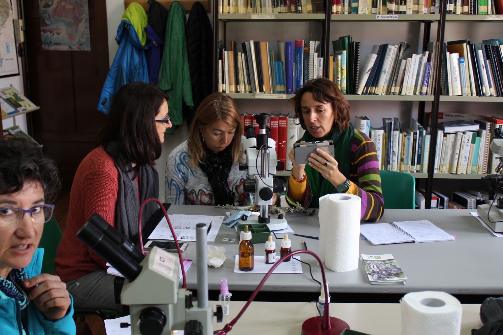 A continuación nos distribuimos en grupos de dos personas y con ayuda de claves (en papel y aprovechando la Wifi digitales), reactivos y las lupas binoculares procedimos a clasificar algunos de los líquenes de los biotipos foliáceo y fruticuloso e incluso a realizar cortes de apotecios para observarlos al microscopio. Nos entretuvimos bastante en esta fase y los asistentes demostraron gran paciencia y perseverancia a la hora de conseguir identificar las muestras aportadas, lo que lograron en casi todas las ocasiones.
