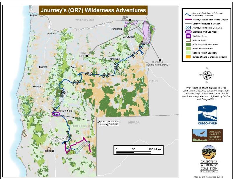 En el oeste de Estados Unidos, el lobo fue concienzudamente erradicado por los colonos blancos a lo largo de los siglos XIX y XX. Durante las tres últimas décadas, como consecuencia de la relajación de la persecución y de acciones directas de conservación, algunas manadas han podido reestablecerse y mantener una existencia precaria, bajo estrecha vigilancia de gestores y ganaderos. Una de ellas es conocida como la manada Imnaha, la primera en ser detectada en Oregón desde los años 40. Sus miembros llegaron desde la vecina Idaho. En 2009 nació en su seno OR7, un macho que pudo ser marcado por científicos con un collar de seguimiento por satélite, y que comenzó su dispersión en el otoño de 2011. Éste es un periodo crucial en la vida de cualquier lobo joven, en el que abandona la manada natal para vivir como “flotante” antes de unirse a otro grupo o fundar uno propio en un nuevo territorio. OR7, el séptimo de los lobos marcados en Oregón, se ha movido desde septiembre en dirección suroeste, atravesando una quincena de condados, diez autopistas y diferentes ecosistemas (pinares, bosques mixtos, campos de lava, zonas agrícolas, enebrales, matorrales…). En su travesía ha pasado exactamente por el mismo lugar en que fue muerto el último lobo de Oregón en 1947, antes del regreso de Imnaha. El 28 de diciembre, OR7 llegó a California, convirtiéndose en el primer lobo salvaje confirmado en este Estado desde hace casi un siglo. En enero de 2012 ha estado deambulando por el condado de Lassen, precisamente donde en 1924 fue atrapado el último lobo de California. Su odisea le ha llevado a recorrer hasta el momento unos 1.300 km, algo así como la distancia entre Vitoria y Bruselas.