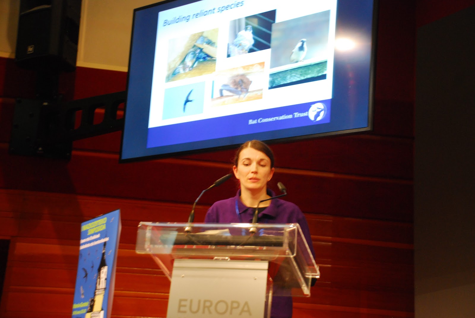 La siguiente ponencia impartida por la inglesa Joanna Ferguson, perteneciente al Bat Conservation Trust de Gran Bretaña, titulada “Wildlife and Buildings, management and conservation”, realizó un recorrido por la labor que efectúa esta ONG en su país entrando a fondo a informar sobre la problemática de la fauna asociada a edificios y las soluciones encontradas y aplicadas por Joanna dentro del BCT con especial incidencia en el grupo de los quirópteros pero también incidiendo en el resto de fauna presente en los edificios de su país. Así mismo mostró una publicación de referencia “Designing for Biodiversity” donde se muestran las posibilidades de los arquitectos diseñando nuevos edificios y obras de rehabilitación de los viejos para adaptarlos a la presencia de fauna.