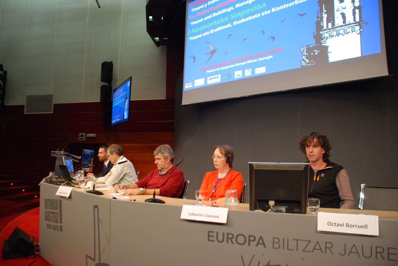 Por último se impartió una original ponencia impartida por Yon Bárcena, arquitecto del Centro de Estudios Ambientales del Ayuntamiento de Vitoria-Gasteiz, titulada “Integración de la Biodiversidad en la edificación: dudas y propuestas para Vitoria”, ofreció una visión muy interesante y original desde el punto de vista de un arquitecto sobre la problemática central del Simposio. Se plantea que el ayuntamiento se va a ir metiendo cada vez más a fondo sobre estos temas y que aunque se han efectuado pocas iniciativas este puede ser un punto de partida. Introdujo finalmente las dudas y preguntas que nos orientaban hacia el debate final del Simposio moderado por él mismo.