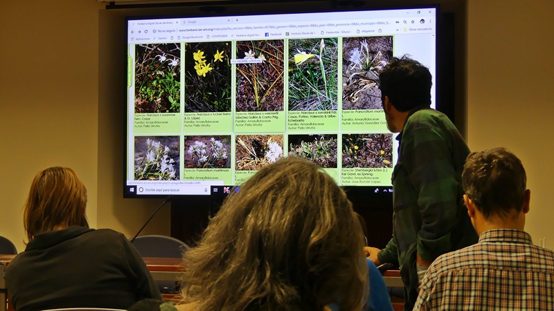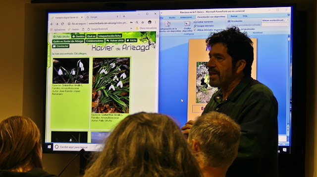 Pello Urrutia expuso el trabajo que el grupo del Herbario Digital viene realizando sobre los narcisos , que sirvió para ilustrar la exposición sobre los Narcissus en la Península Ibérica y su estado de conocimiento actual, su distribución, taxonomía y nomenclatura.