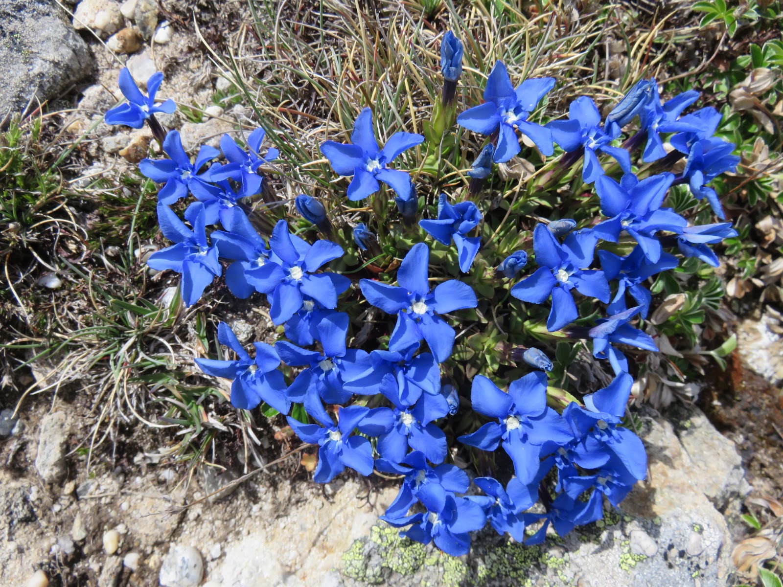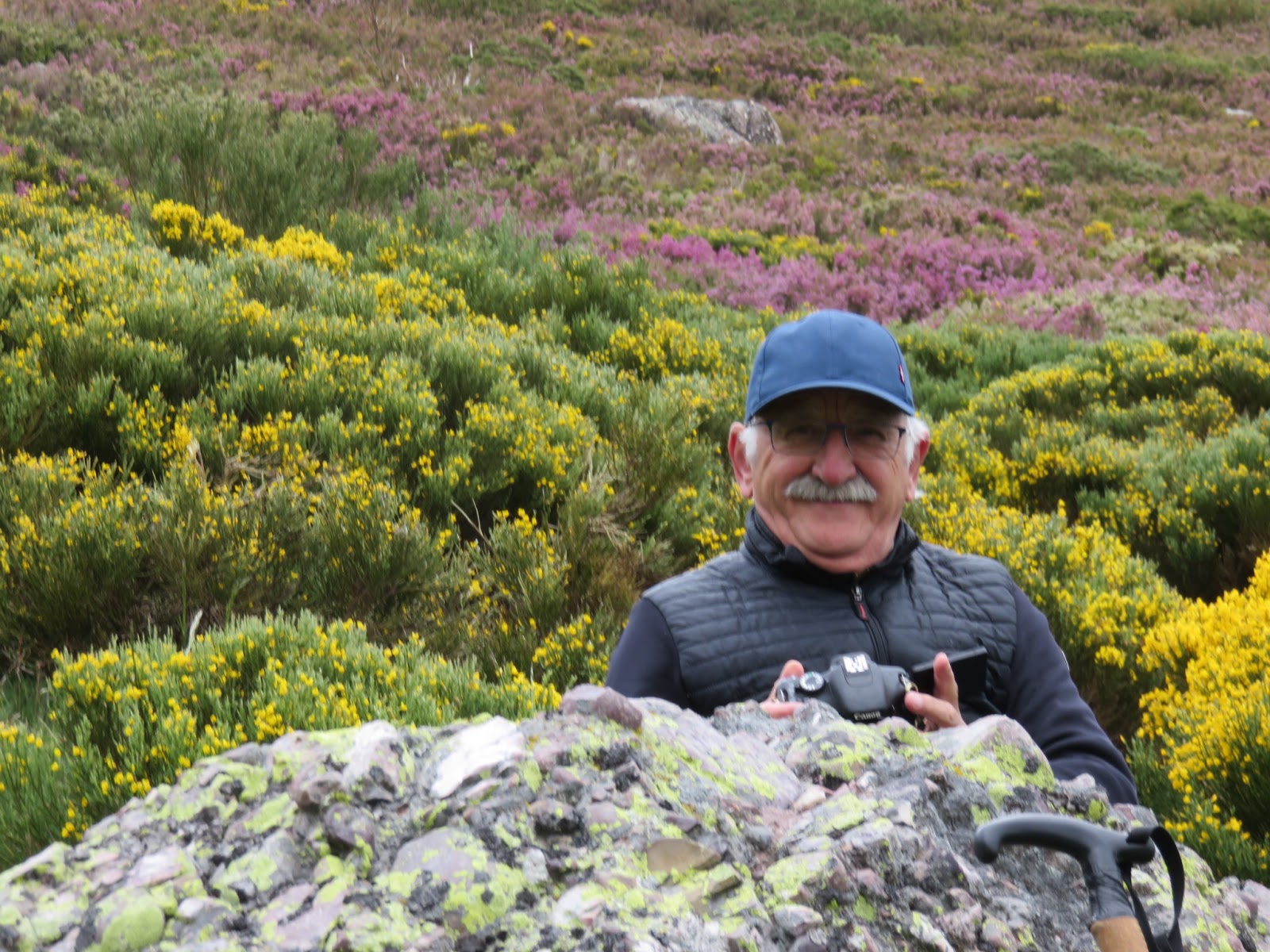 La ascensión al Valdecebollas fue preciosa, entre el amarillo del piornal en flor donde comenzamos la marcha cuesta arriba, con los brezos rosas y blancos en flor, y un arroyo lleno de ranúnculos y flora palentina que ya podéis consultar en el Herbario. Enseguida apareció un gran rebaño de ovejas algo grisáceas, recién esquiladas. Nos fascinaron las flores de alta montaña, la Viola palentina, las Gentiana verna, con su azul genciana, entre otras muchas, y cuando apareció en las alturas Androsace cantabrica, con sus almohadillas de flores rosa, Pello dijo que era una maravilla de planta, y una de las que buscábamos. Félix iba fotografiando los líquenes, que también figuran ya en el herbario. La niebla fue adelgazando rápidamente hasta desaparecer del todo, y pudimos ver paisajes de montes imponentes abrazados de nubes. Íbamos felices, claro, parándonos en todas las plantas de interés, que para algunos eran casi todas.