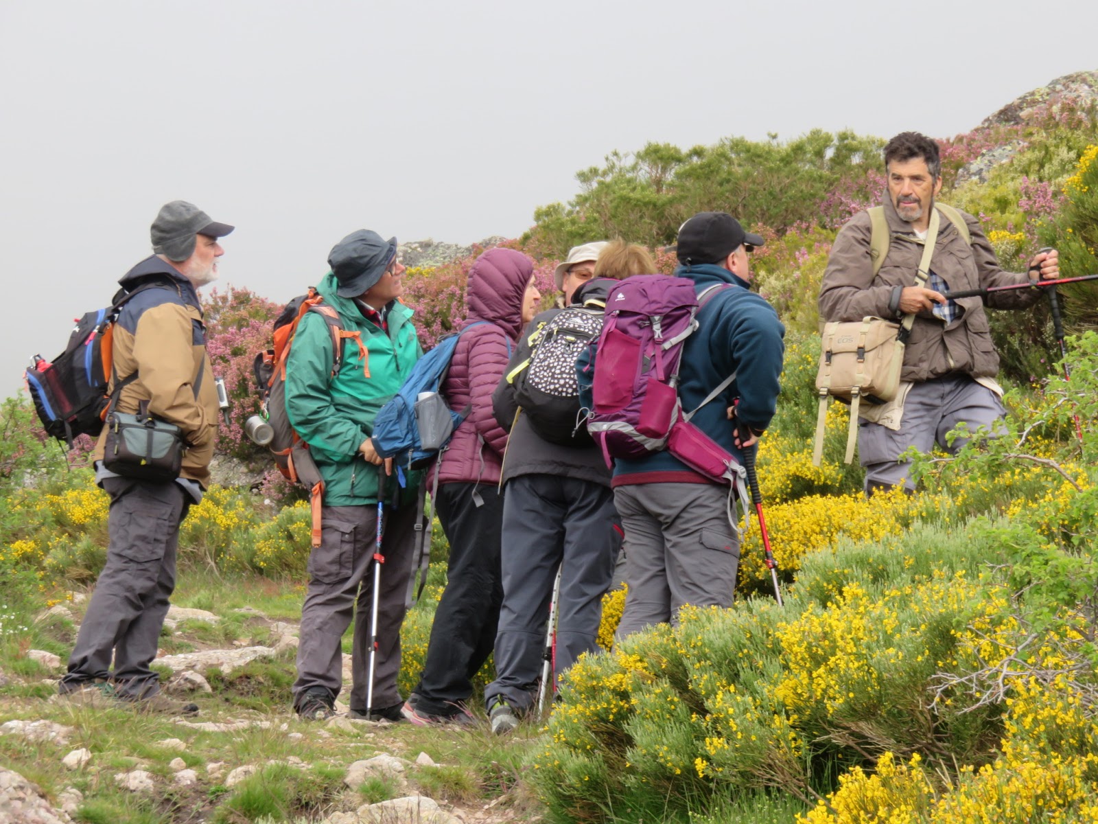 Ya el descenso del coche fue emocionante al encontrarnos a algo más de mil metros de altitud en un pueblecito precioso, de una pieza, con casas de piedra, que se fundían con el terreno por su color parecido, varios nidos de cigüeña con cigoñinos siendo alimentados constantemente por su padres, al lado de nuestra casa y a la altura de los ojos, un aire puro y una luz maravillosa, en un valle verde y envolvente. Se respiraba una paz alegrada por todos nuestros compañeros, que nos esperaban, y una de esas casas era la nuestra, donde dejamos los equipajes y fuimos a dar un paseo hasta La posada del Santuario del Carmen, un poco más elevada y apartada que la nuestra y donde se alojaban los cuatro que nos faltaban en la plaza del pueblo. Fuimos a verlos y recogerlos para cenar todos juntos en la casa de Ana, al lado de la nuestra. El paseo de diez minutos, lleno de flores y aire puro, nos encantó a todos, y nos permitió a los recién llegados estirar las piernas y apercibirnos de donde estábamos. También de irnos conociendo, ya que había algunos socios nuevos, con los no habíamos hecho antes excursiones de este tipo y con los que disfrutamos de un intensa vida social y naturalista, y al partir éramos ya íntimos. La cena de picoteo en casa de Ana no hizo sentirnos a todos como en casa, relajados y felices, de vacaciones entre amigos.