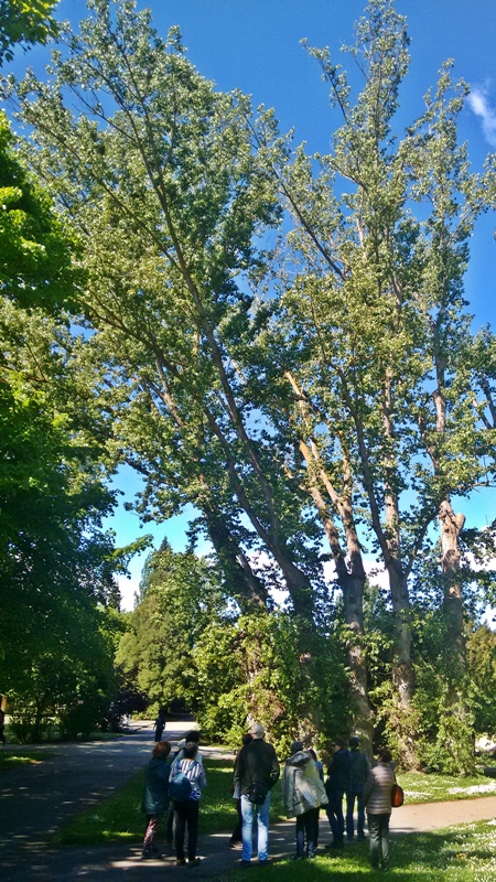 En esta visita guiada también hemos podido conocer mejor distintas especies tanto autóctonas (Quercus robur, Acer campestre y monspessulanum, Populus alba y nigra, Fagus sylvatica, Prunus spinosa, Taxus baccata…) como alóctonas (Robinia pseudoacacia, Gleditsia triacanthos, Cercis siliquastrum, Ginkgo biloba, Sequoiadendron giganteum ysempervirens, Liriodendron tulipifera…) mientras se nos explicaba distintas curiosidades respecto a la disposición de las flores, el desarrollo de las raíces y su problemática en el entorno urbano, los crecimientos en flechado y las podas más o menos afortunadas, o ciertas rebeldías de la naturaleza por no tender hacia los injertos frustrados del jardinero.