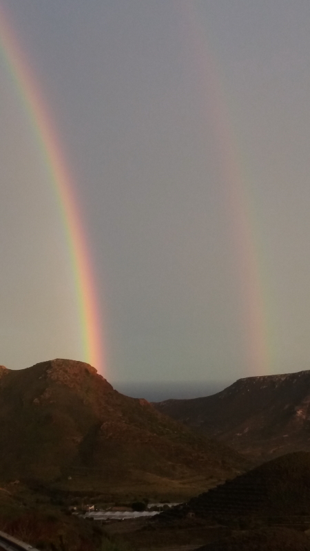 Nos esperaba un largo camino hacia Las Negras y llegamos con la luz amarillenta del atardecer, con una fina lluvia y un espectacular y nítido arco iris doble que enmarcaba Las Negras y nos recibía con todos los honores.