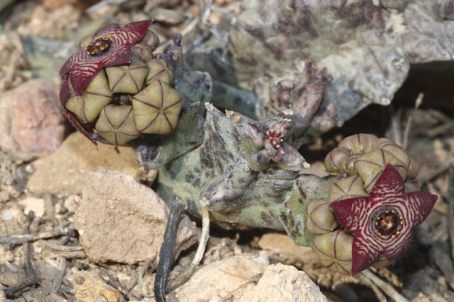 Dando un paseo por los alrededores del faro y hacia la cala del Moro Santo, vimos la Lapiedra martinezii y, gracias al hábil ojo de Santi, la Caralluma europaea, que parecía una piedra más, por su color y forma.