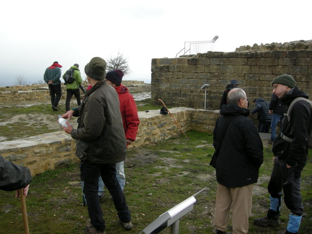 Paró un poco el temporal y al abrigo de las murallas, pudimos contemplar la preciosa vista de los alrededores. Nuestro amigo Félix tiro de avituallamiento y con un poco de queso, fiambre y bota de vino nos animó el regreso.